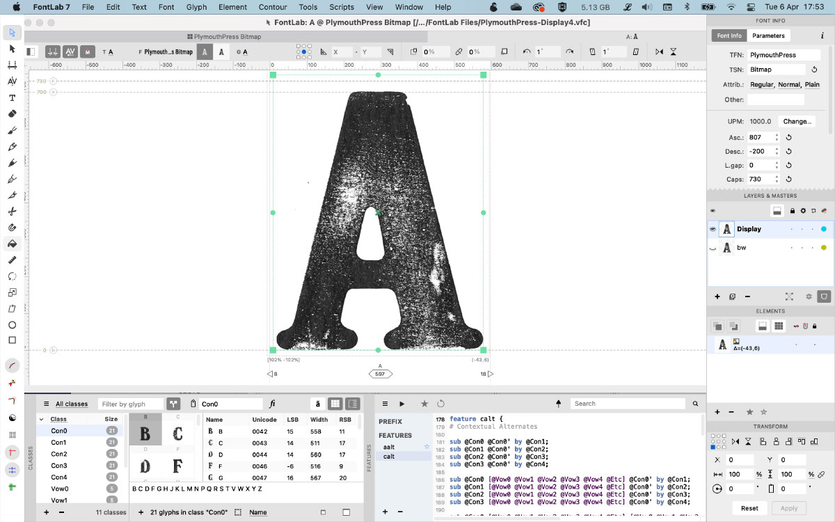 The font uses SVG-images instead of the usual vectors to render each character, allowing for a more faithful reproduction of the textures present in the original prints. Scripts embedded into the font file enable alternate versions of each letter to be presented automatically as you type, giving a 'randomised' appearance.